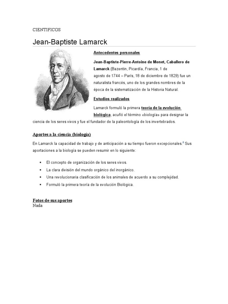 Fue el primer naturalista que formuló una teoría completa (el lamarckismo) de la evolución biológica, rechazando la invariabilidad de las especies... Fue el primer naturalista que formuló una teoría completa (el lamarckismo) de la evolución biológica, rechazando la invariabilidad de las especies. 04/12/2011 · jean baptiste de monet (caballero de lamarck) lamarck nació el 1 de agosto de 1744 en parís, y murió el 18 de diciembre de 1829. Fue un naturalista francés, uno de los grandes nombres de la época de la sistematización de la historia natural, cercano en su influencia a …